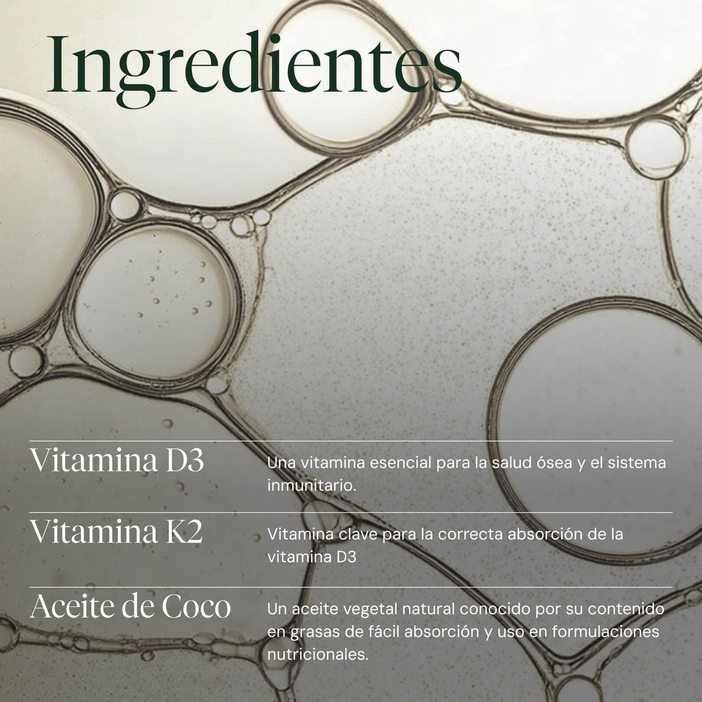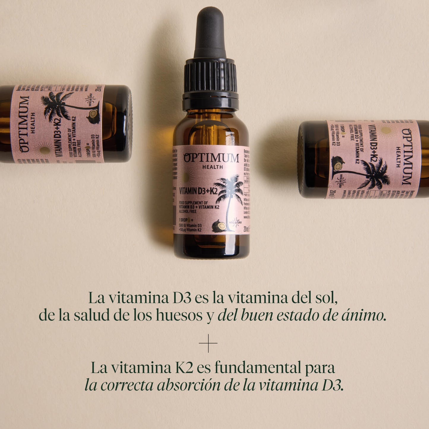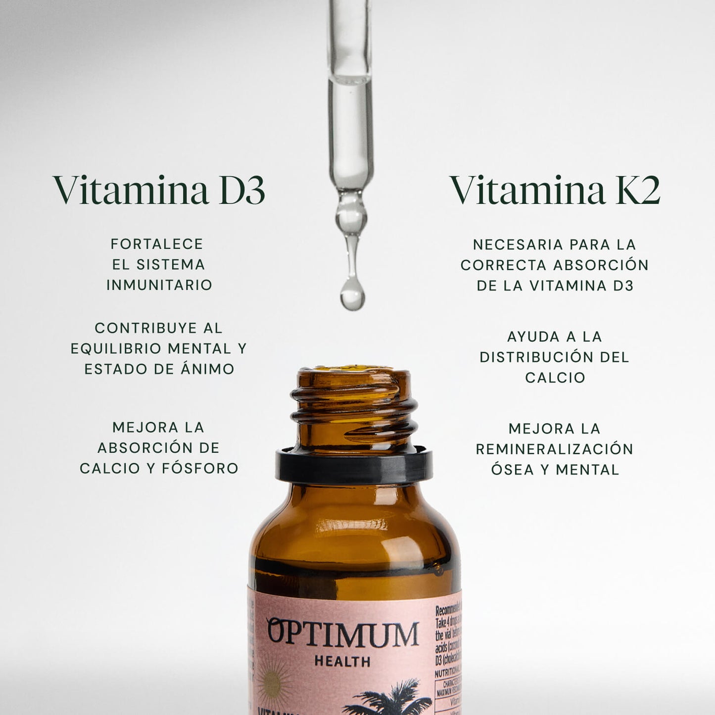 Optimum presenta la vitamina D3 + K2 líquida altamente concentrada y biodisponible en aceite MCT, extraído del aceite de coco. Proviene de fuente natural, es liposoluble y se absorbe mejor gracias a los lípidos facilitadores del aceite MCT de cadena media del aceite de coco.