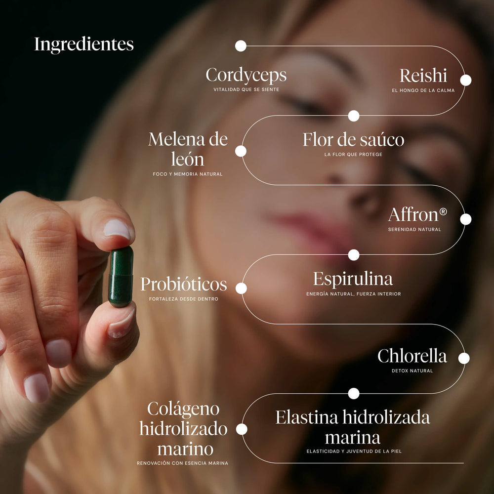 INGREDIENTES QUE EQUILIBRAN seis pilares esenciales: inmunidad, sueño, digestión, estrés, energía y belleza.