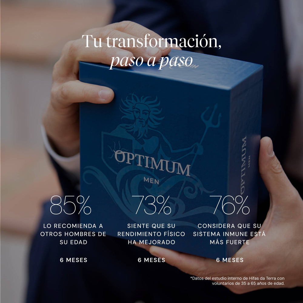 OPTIMUM MEN es un suplemento innovador que da respuesta a las 3 principales necesidades de los hombres para mantener un buen estado de salud y bienestar, consiguiendo un pleno rendimiento físico y emocional. Su fórmula avanzada, que incluye extracto de raíz de Ashwagandha KSM-66, está desarrollada para conseguir una energía sostenible, mejorar la resistencia muscular, potenciar la concentración, aumentar la libido y equilibrar el sistema inmunológico y los niveles de testosterona.